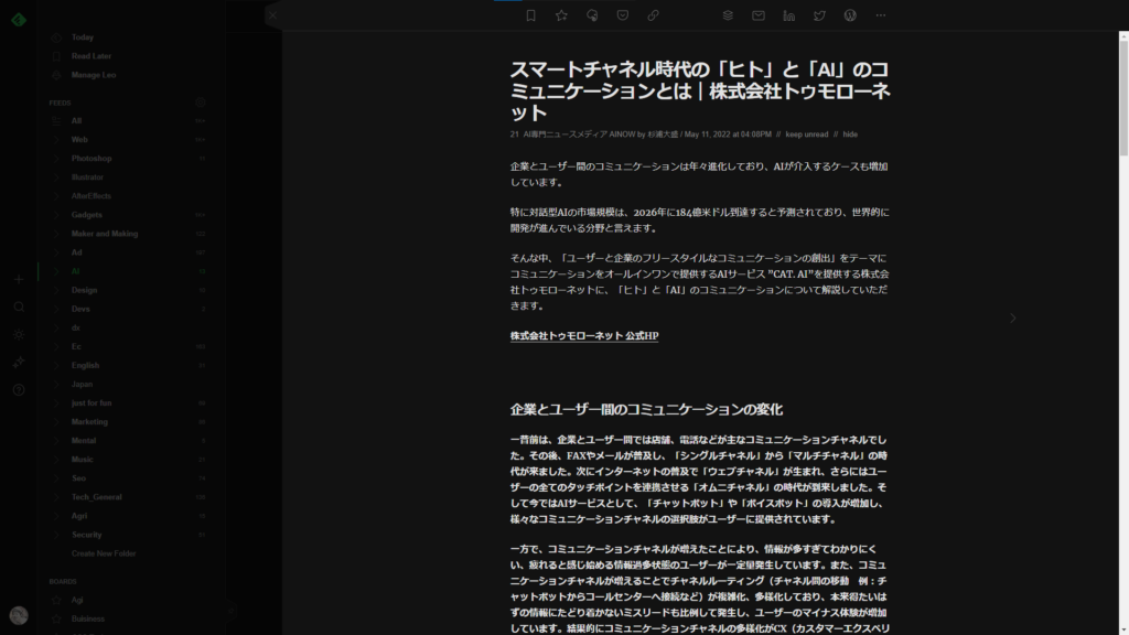 Hi, there. Today, I’d like to introduce Feedly, an article aggregation service that I’ve been using for many years.