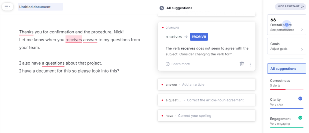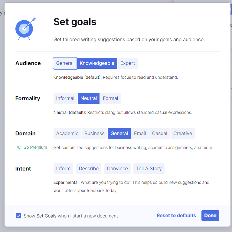 By setting goals for your writing in advance—such as the type of tone or style you want—Grammarly can provide recommendations tailored to your needs.