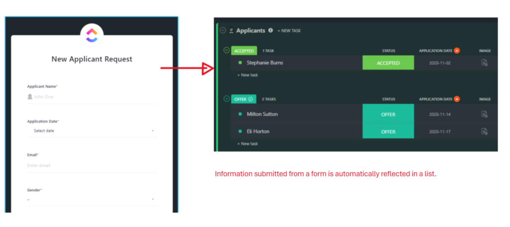 For example, when applicants submit their name, phone number, and resume through a dedicated form, this data, including any attached files, is automatically reflected in the applicant list.