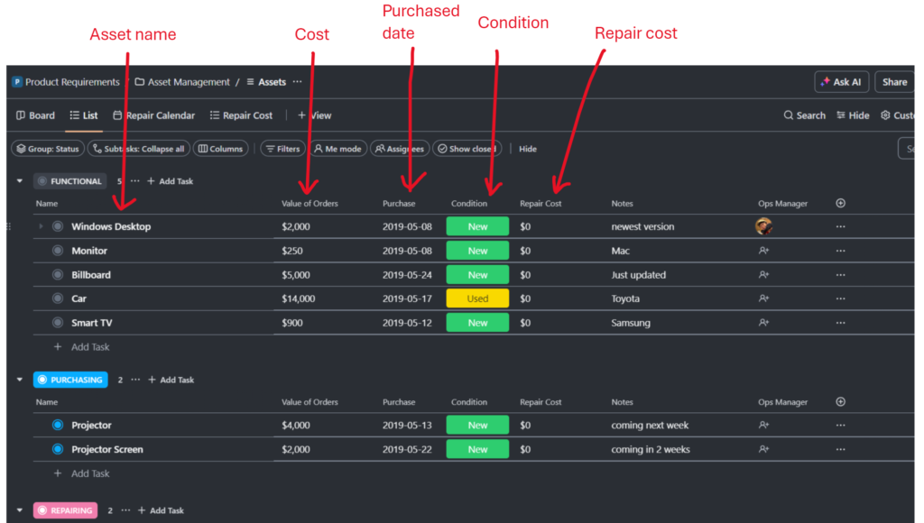 You can also manage assets, such as equipments, by setting up custom fields to track information such as purchase date, condition, and usage status, as shown below.
