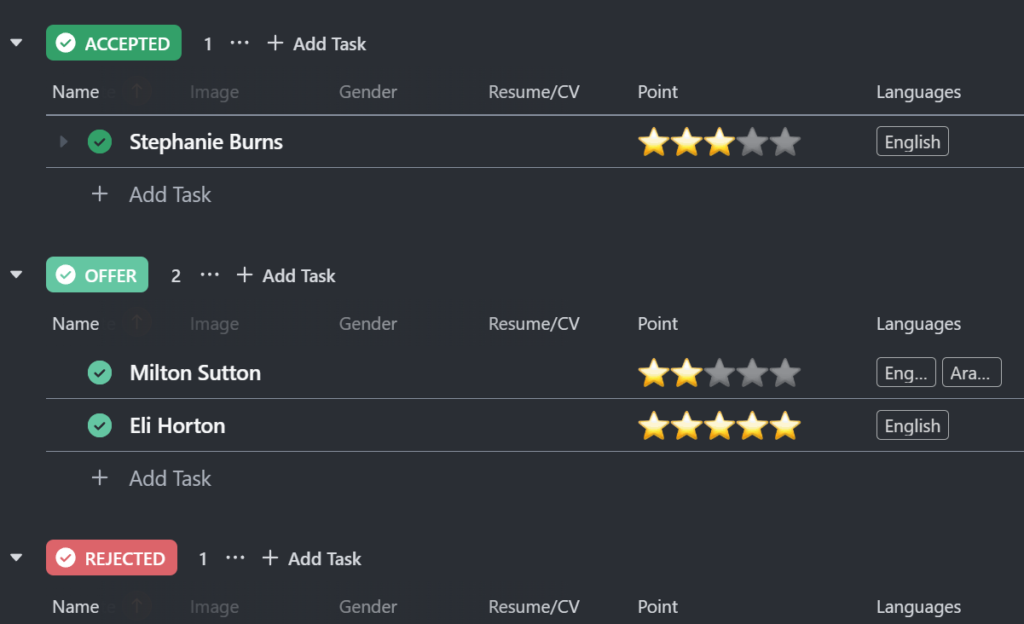 You can easily track the progress of interviews using custom fields, allowing you to see whether an applicant is in the initial interview stage, final selection, or has been hired.